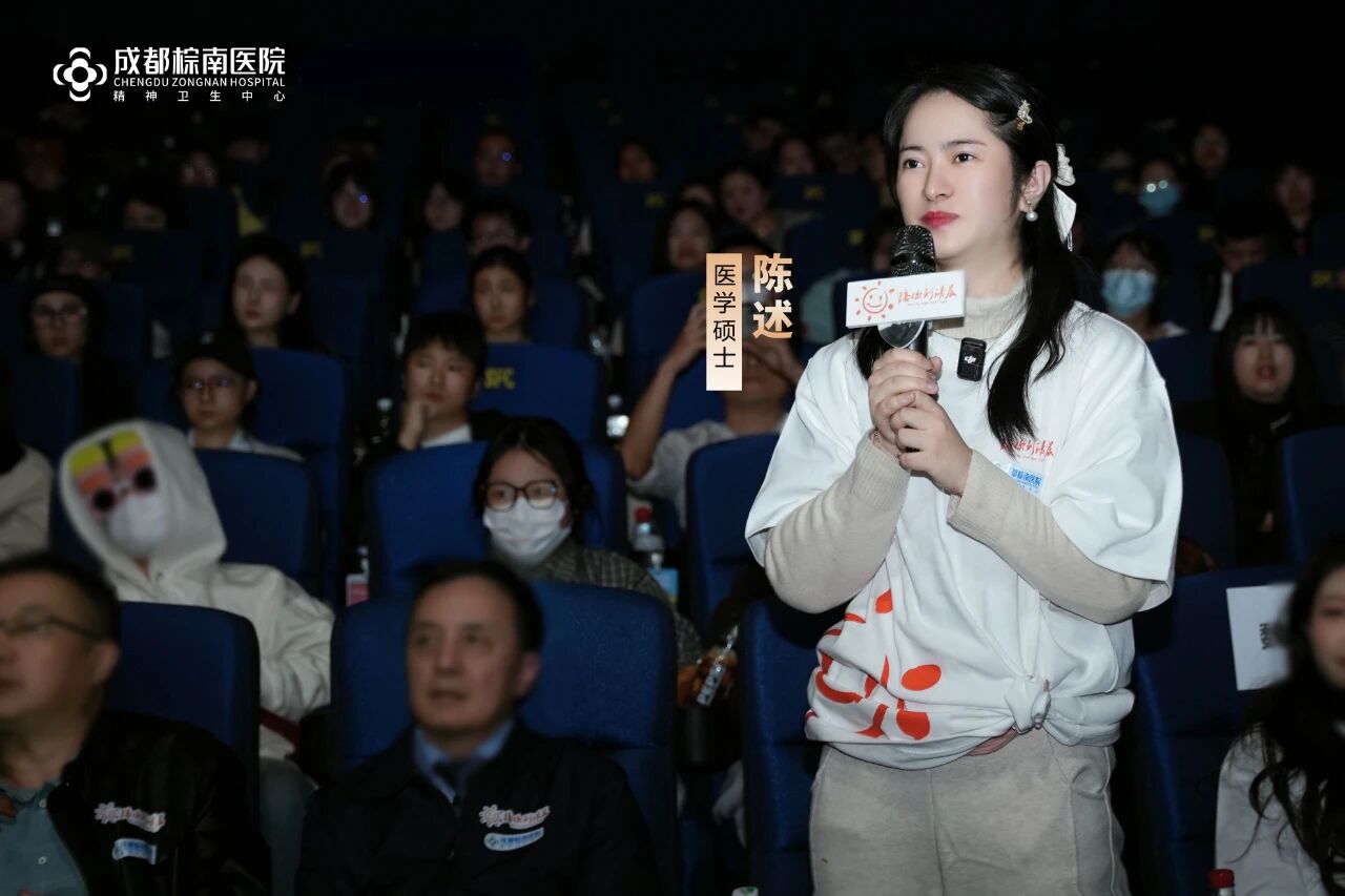 在映后互动环节,成都棕南医院魏显仪心身医学团队成员魏显仪医生、陈述医生,结合影片中所呈现的青少年心理状态与家庭互动模式,就“大学生如何实现有效自我关怀”、“如何协助休学青少年顺利复学”等实际问题进行了专业解析,系统阐述了从情绪低落到社交回避,再到心理危机的演进路径,并提供了实际应对建议。